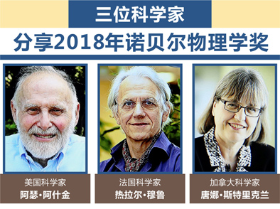 10月2日,瑞典皇家科學院在斯德哥爾摩宣布,將2018年諾貝爾物理學獎授予美國科學家阿什金、法國科學家穆魯以及加拿大科學家斯特裏克蘭,以表彰他們在激光物理學領域的突破性貢獻。