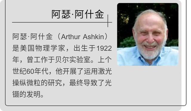 阿瑟·阿什金(Arthur Ashkin)發明了光學鑷子,能用激光束夾起粒子、原子、分子。它還能夾起病毒、細菌及其他活細胞,並能讓它們在檢查和處理時不被損壞。阿什金的光學鑷子為觀察和控制生命的機器創造了全新的機會。