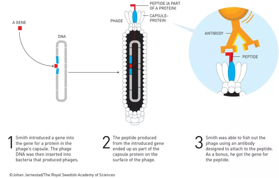 喬治·史密斯開發了一種稱為噬菌體展示的方法,其中噬菌體——一種感染細菌的病毒——可用於進化新蛋白質。
