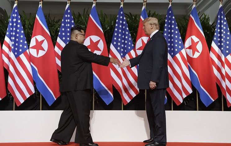 6月12日,朝鲜最高领导人金正恩(左)与美国总统特朗普在新加坡举行会晤。