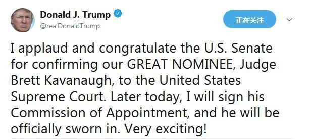 特朗普随后发推文说:“我要赞许和恭贺美国参议院,同意把我们的最棒提名人卡瓦诺法官,送进美国最高法院。稍后,我就会签署他的任命书,他将会正式宣誓。令人非常兴奋!”