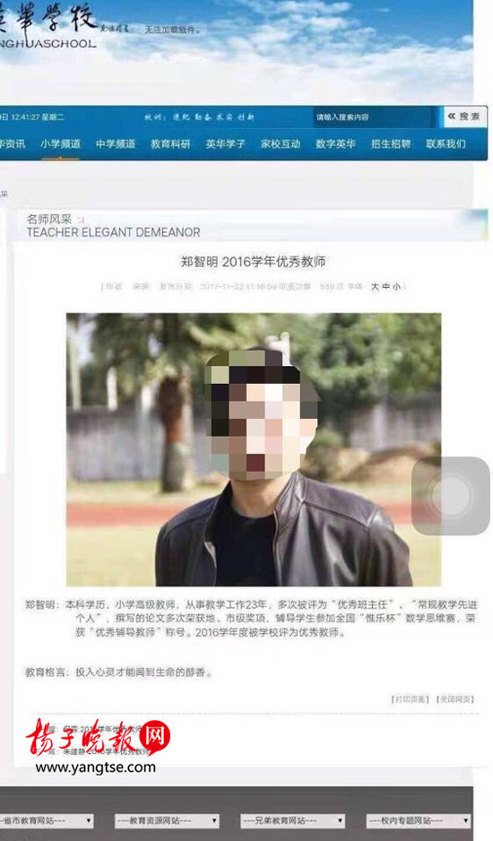 在乐清英华学校官网“教师风采”一栏可以看见,他于2016学年度被学校评为优秀教师。但扬子晚报记者搜索后发现,优秀教师一栏已经没有郑智明,并且官网搜索该名字也没有任何信息。