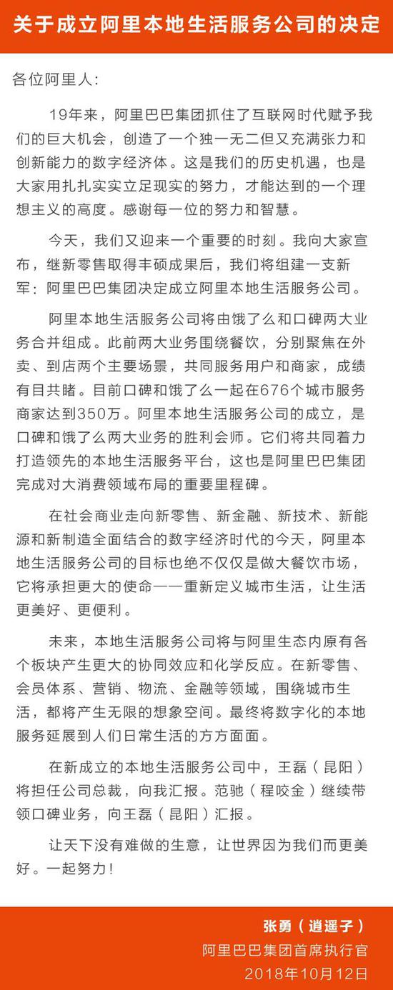 今天,我们又迎来一个重要的时刻。我向大家宣布,继新零售取得丰硕成果后,我们将组建一支新军:阿里巴巴集团决定成立阿里本地生活服务公司。