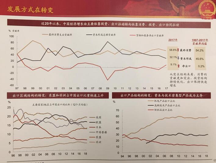 王毅表示,从GDP核算的角度来看,推动经济增长的投资、消费和净出口的贡献比重在增大。在1997年到2017年的20年间,消费对经济增长的平均贡献率是54%,到2017年提升至58.8%;消费超过投资成为中国经济增长最大的贡献动能;出口的结构也在发生变化,虽然这些年中国在全球的出口份额没有太多提升,但是出口的结构在发生改变。一般性的加工和劳动性密集的产品的出口在迅速下降,比如衬衣、毛纺织业都被非洲和东南亚的一些国家生产的产品所替代,但是机电产品和高新技术产品的出口份额在提升。