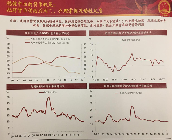 关于财税体制改革,十九大报告中提出了三大任务,第一个是完善分税制,厘清中央和地方的财政关系;第二个是完善预算管理,特别是花钱的绩效考核要完善,要把钱花在刀刃上;第三个是完善税收制度改革。从这些指标来看,这些年中国的财政政策取向一直是实施积极的财政政策。今年三季度以后,为了应对中美贸易摩擦,中央政府要求积极的财政政策更加积极,整个市场认为这是一个很大的转变,王毅对此进行了澄清,实际上财政政策并未发生很大的转变,过去多少年中国一直是积极的财政政策,积极并不是指赤字率,从赤字率的变化来看,今年的赤字率较2017年的3%向下收缩。
