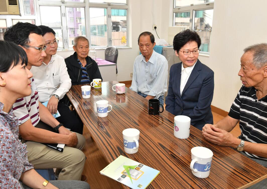 林鄭月娥昨日在屋宇署署長張天祥、機電工程署署長薛永恒、市建局總監何志偉及中西區民政事務專員黃何詠詩陪同下,到訪威利麻街一幢52年樓齡、13層高的舊樓,與幾名身兼業主立案法團成員的居民交流,聽取他們介紹大廈過去的維修工作和未來的需要。