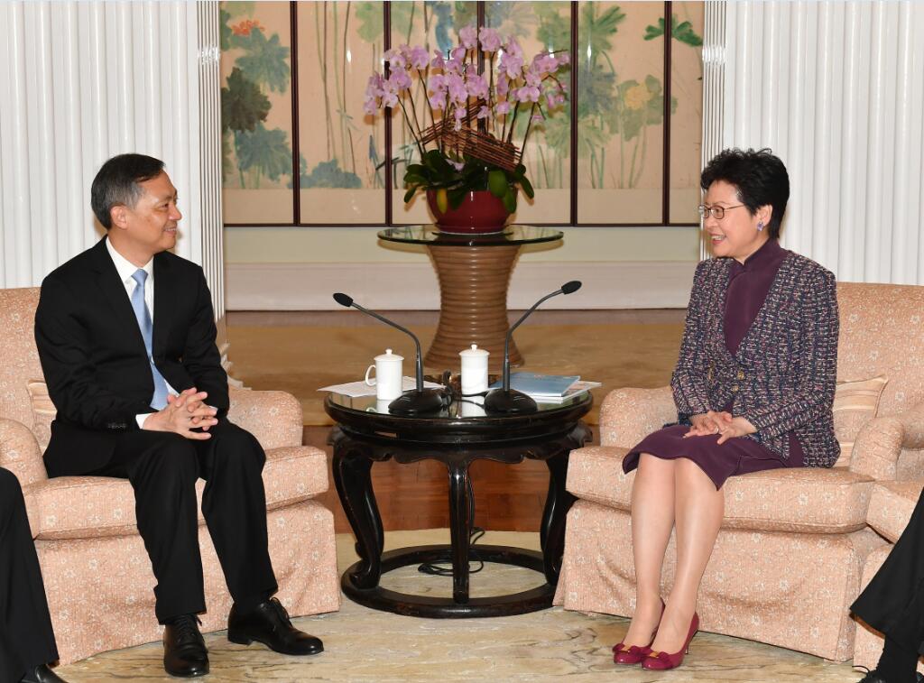 林鄭月娥歡迎張碩輔訪港,感謝他在上月廣深港高鐵香港段開通儀式當日,親臨廣州南站接待乘坐「動感號」列車抵達的她和其他嘉賓,並向她介紹了廣州的最新發展。