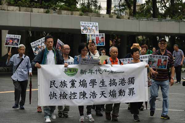 團體「新年代」昨日舉行「快檢控港獨陳浩天」遊行集會,他們高叫口號「煽學生搞港獨、快檢控陳浩天」、「港獨入侵校園、莘莘學子受害」、「煽動仇恨國家、觸犯刑事罪行」等。他們又遊行至律政中心,向代表遞交請願信。