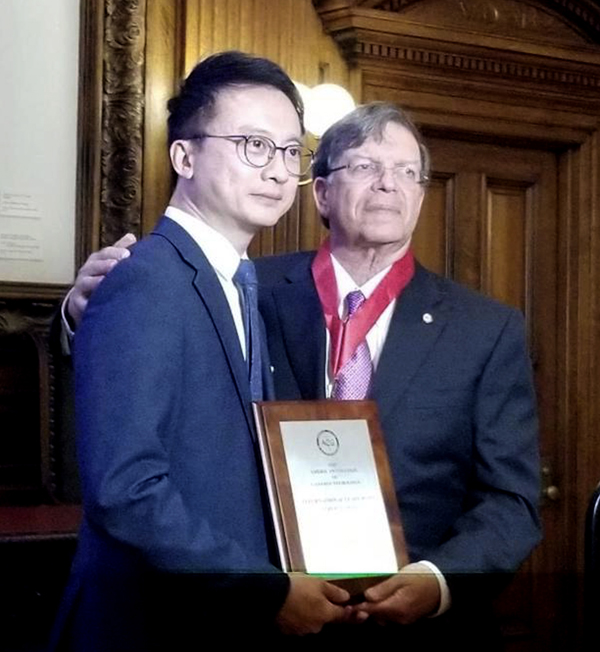 陳家亮(左)於本月初舉行的美國腸胃科醫學院年度大會上接過今年的「國際領袖大獎」。
