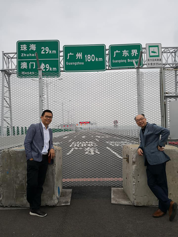 陳恒鑌在其臉書上載與陳帆在大橋粵港分界線打卡的圖片。在23日舉行開通儀式後,分界線上的石躉和隔離網將拆除。