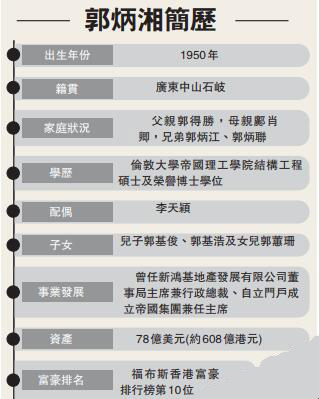 【香港商報網訊】帝國集團創辦人兼主席、新鴻基地產前主席郭炳湘昨早病逝,享年68歲。郭炳湘是郭氏家族的長子,曾經出任新鴻基地產主席近20年,1997年被綁架,家人支付6億元贖金後獲釋,因此患上躁鬱症。其後,郭氏家族爆發爭產,郭炳湘離開新地,創立帝國集團,積極投地起樓。據福布斯排行榜資料,郭炳湘身家達78億美元(約608億港元),為全球富豪榜第199位,2018年香港富豪榜第10位。郭炳湘於今年8月27日於家中因為中風暈倒後,延至昨早證實死亡。