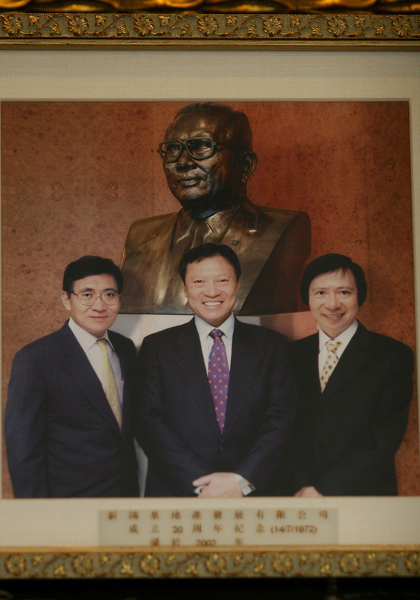 2008年3月,(左起)新鴻基地產發展有限公司郭炳聯、郭炳湘和郭炳江與新鴻基地產發展有限公司創辦人之一郭得勝的銅像合影。