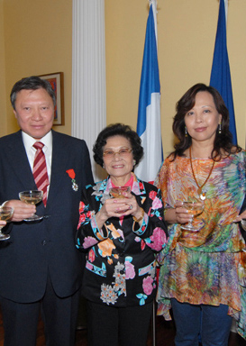 2008年7月,郭炳湘(左)和其母郭鄺肖卿(中)及妻子李天穎(右)合照。
