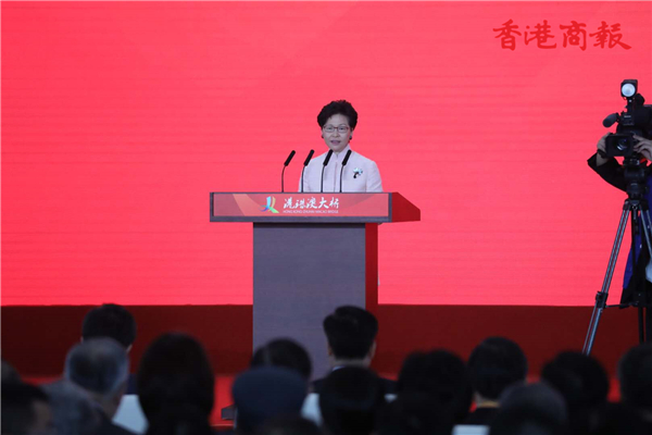 林鄭月娥致辭時表示,大橋的落成為三地未來發展帶來新動力,令香港角色由過往的聯繫人轉為參與者。
