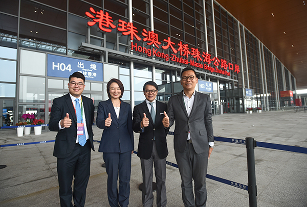 港區人大代表(左起)陳勇、李君豪、洪為民及李應生,昨於大橋開通儀式中合照留念。 中通社