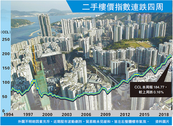 【香港商报网讯】记者吕婉玲报道:外围不明朗因素充斥,近期股市波动剧烈,贸易战未见缓和,皆左右整体楼市气氛。反映二手楼价走势的中原城市领先指数(CCL),最新报184.77点,按周跌0.16%,为2016年2月后32个月首次连跌4周。而新界西指数未能止跌返回升轨,或重启新一波跌浪,并牵引楼市下行。