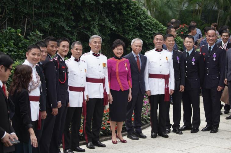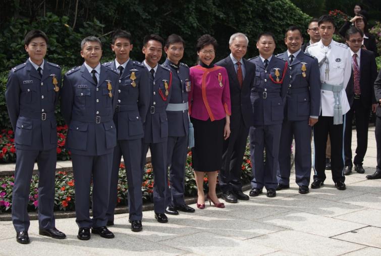 多名飛行服務隊成員和消防員,在去年熱帶氣旋「天鴿」和「帕卡」襲港期間救人,獲頒銀英勇勳章或銅英勇勳章。