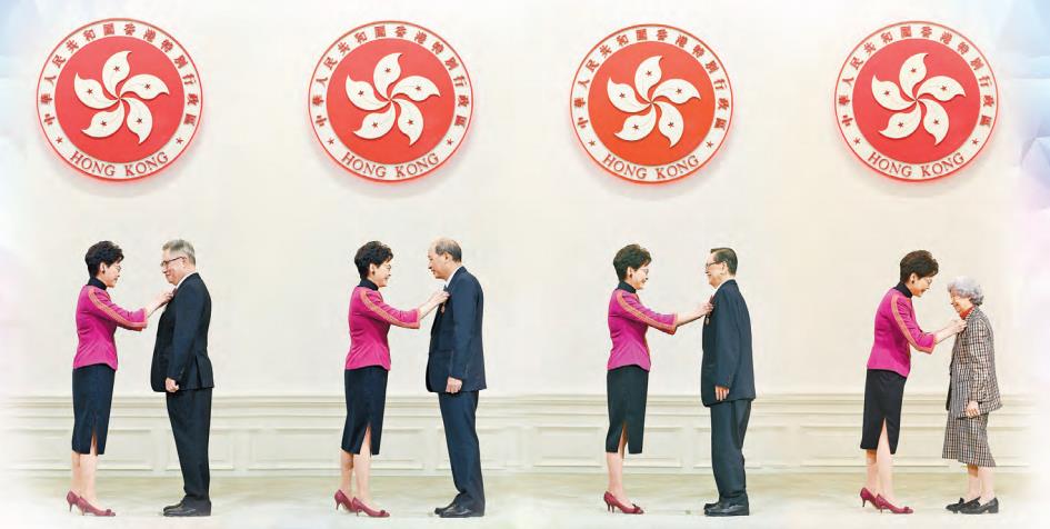 行政長官林鄭月娥昨日在禮賓府舉行的2018年度勳銜頒授典禮上頒授大紫荊勳章。左起受勳者分別為鄧楨、張學明、陳有慶、楊紫芝獲頒勳銜。政府新聞處