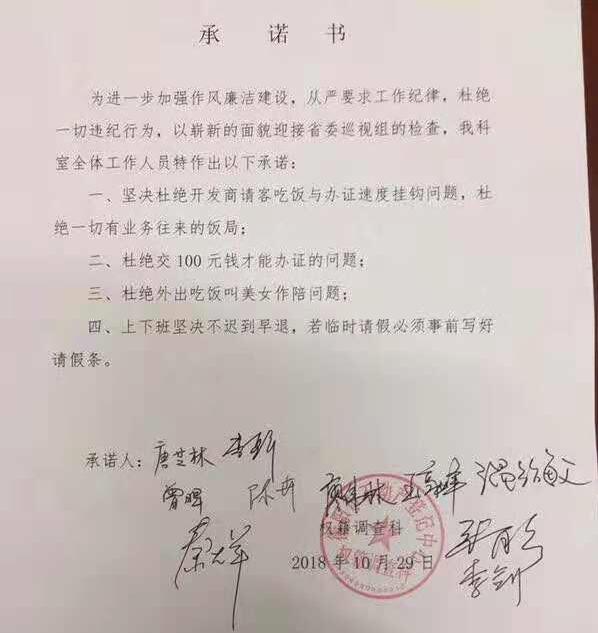 网传的承诺书显示,为进一步加强作风建设,从严要求工作纪律,杜绝一切违纪行为,以崭新的面貌迎接省委巡视组的检查,我科室全体工作人员特作出以下承诺:一:坚决杜绝开发商请客吃饭与办证速度挂钩问题,杜绝一切有业务往来的饭局;二、杜绝交100元钱才能办证的问题;三、杜绝外出吃饭叫美女作陪问题;四、上下班坚决不迟到早退,若临时请假必须事前写好请假条。