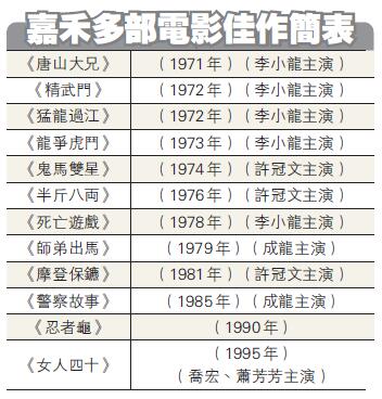 而成龍亦憑藉嘉禾的《警察故事》,奠定國際電影巨星地位,後來成龍再加洪金寶、元彪3位動作巨星,成為嘉禾三寶。此外,1989年嘉禾更進軍荷里活,與美國片場合作《忍者龜》又再大賣,全球票房收16億美元,令鄒文懷蜚聲國際,奠定香港影壇大亨的地位。