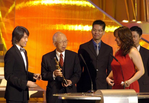 第24屆香港電影金像獎頒獎禮上,鄒文懷(左二)與周星馳(左一)向李小龍女兒頒發中國電影世界光輝之星獎。