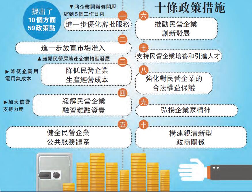 據了解,廣東的《民營經濟十條》正文共10個方面,涵蓋59個政策點,其中包括:進一步優化審批服務、進一步放寬市場准入、降低民營企業生產經營成本、緩解民營企業融資難融資貴、健全民營企業公共服務體系、推動民營企業創新發展、支持民營企業培養和引進人才、強化對民營企業的合法權益保護、弘揚企業家精神和構建親清新型政商關係。