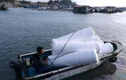 肖宇金正忙碌着往渔排上运载泡沫浮球,在他和工人的努力下,渔排终于浮出水面。