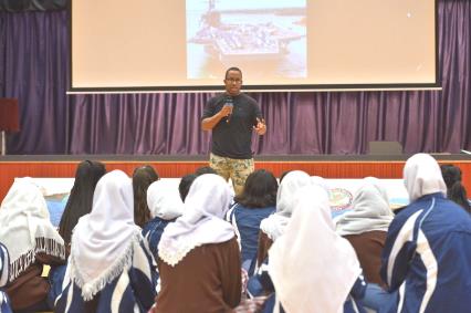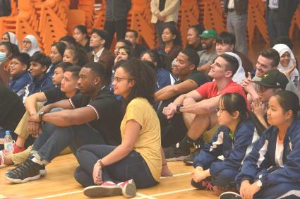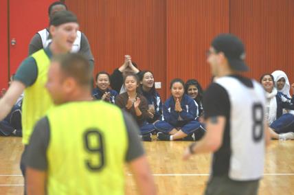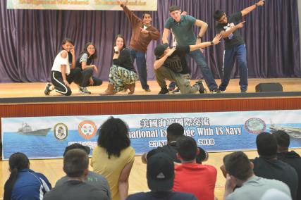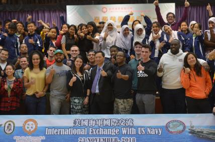 美國航空母艦列根號(USS Ronald Reagan)日前聯同3艘美國軍艦訪港,停泊於青衣對出海域,約20名官兵今到屯門探訪中學,與約30名中二及中六學生大玩閃避板遊戲,場面熱鬧。