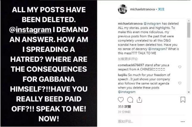 然而,曝光Stefano Gabbana辱华言论后,Michaela账号上的内容却因为“散布仇恨言论”而被平台删除。就连自己以前发的那些跟该事件无关的内容也被删除。Michaela质疑道,Gabbana自己的言论后果还没看到,自己账号倒被限制,平台是否被买通,要求给出说法。据内幕网(insider)报道,对此,Instagram拒绝评论。