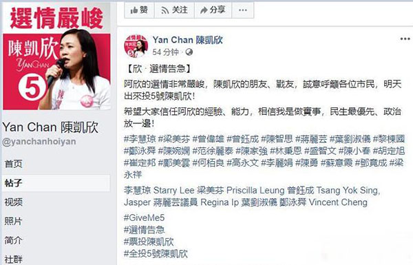 陳凱欣昨日在facebook亦發佈短片,表示根據不同機構所做的民調顯示,自己的選情十分十分嚴峻,加上今次有5個候選人去爭1個議席,較以往的選舉難度更高,故她十分希望大家全家總動員,投票支持5號陳凱欣。