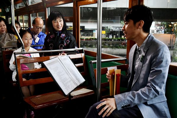 一眾嘉賓和非物質文化遺產大使在電車上欣賞藝團「一才鑼鼓」的南音說唱表演。
