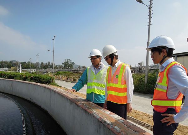 發展局副局長廖振新(中)、渠務署助理署長/機電工程崔偉誠(左)和水務署署理助理署長黃恩諾(右)參觀石湖墟污水處理廠的最後沉澱池。