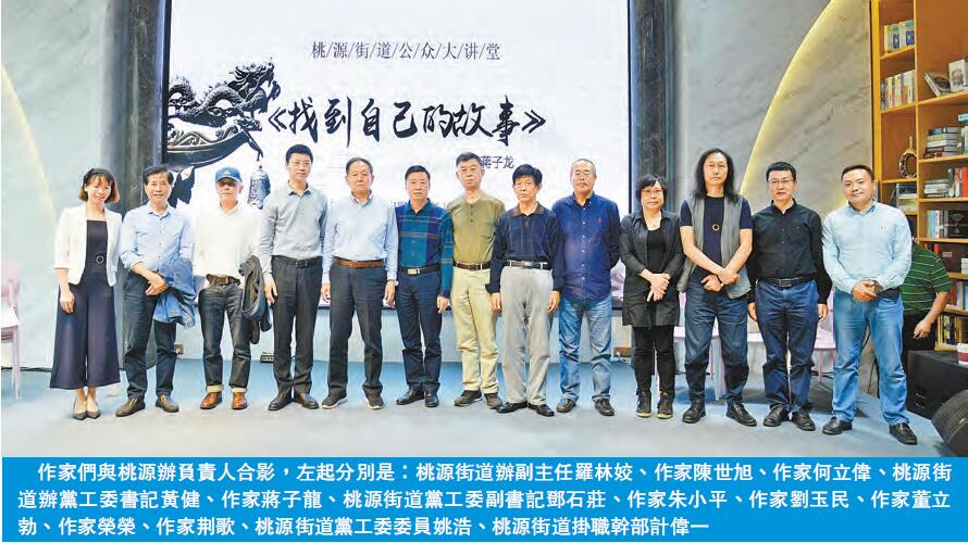 【香港商报网讯】继ProTalk院士沙龙活动之后,11月24日(周六)上午9:30,深圳南山智园B1栋智园党群服务中心大厅,桃源公众大讲堂第二期迎来了8位重磅级文学大咖。分别是蒋子龙、何立伟、陈世旭、刘玉民、董立勃、荊歌、荣荣、朱小平。现场座无虚席,蒋子龙做了主题为《找到自己的故事》的讲座,之后与其他7位嘉宾一起在台上分享观点,与观众互动交流。蒋子龙签书环节排起了长龙。此外作家们还参观了新视艺创客公园以及南方科技大学琳恩图书馆,最后作家们还为桃源留下了珍贵的墨宝。