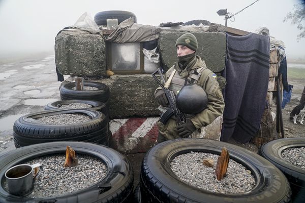 根據烏克蘭總統令,從基輔時間28日9時起,烏部分地區進入為期30天的「戰爭狀態」。圖為一名士兵在烏東部城市別爾江斯克一處檢查站執勤。 新華社