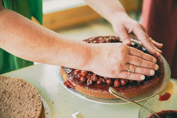 除了表面鋪有櫻桃,蛋糕的夾層里也有濃郁的櫻桃肉和櫻桃醬。