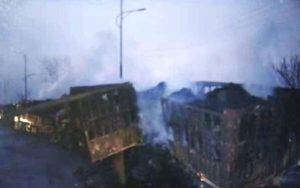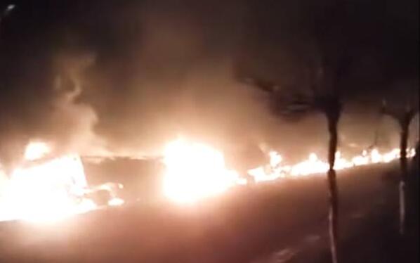 央视新闻报道的一段视频显示,沿路多辆货车被破坏严重,车头严重变形,挡风玻璃和车窗消失,只剩钢架。有的货车车胎熔化,只剩下车轱辘。附近楼栋外墙也是一片漆黑。