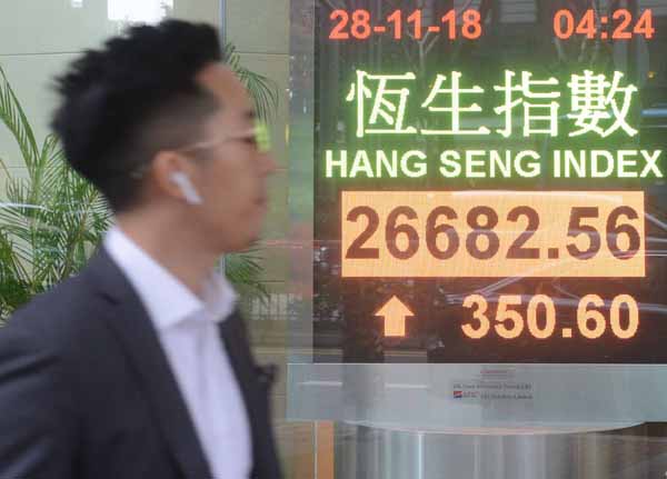 【香港商報網訊】記者吳天淇、鍾穎琳報道:憧憬「習特會」化解中美緊張氣氛,A股港股同步造好。在昨天期指結算日前夕,恒指反彈逾300點,創近兩個月高位,不排除進一步挑戰27000點關口。