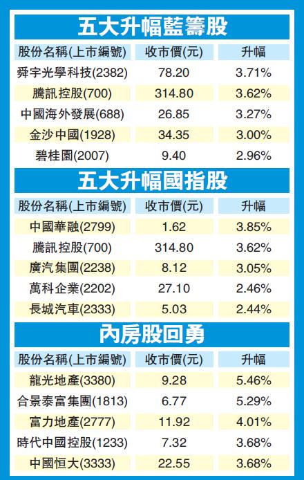 藍籌股普遍上揚,騰訊(700)再度領軍,全日升3.6%,貢獻恒指91點升幅。滙控(005)升0.8%,平保(2318)漲1.1%,友邦(1299)走高0.5%,建設銀行(939)升1.2%。內房股亦見資金追入手影,其中二線升勢較勁,龍光(3380)飆5.5%,合景(1813)彈高5.3%,旭輝(884)揚4.5%,SOHO(410)抽高4.9%,富力(2777)升4%。