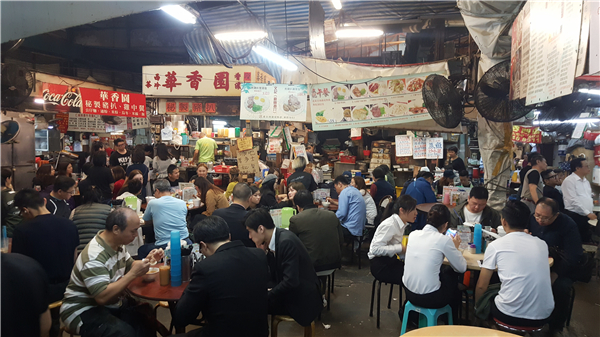 街市今晚將停水停電,熟食檔昨日最後營業,午市其門如市,其中以秘製豬扒包和咖?厚多士為招牌菜的華香園,未到2時已沽清。另一間食檔合香園,以奶茶和咖?多士出名。與友人正在品嘗奶茶的一名女士說,在北京道年代已幫襯大排檔,搬到海防道後仍常常來,她說店的咖?多士很好吃,是亞蘇(飲食節目主持人蘇施黃)至愛,所以想食這招牌食品,說亞蘇至愛便可以了。但她亦指這裏環境差,重建是無可避免,期望工程完成後,可以再與店員重逢。她說罷即與相熟店員拍照一番留念。
