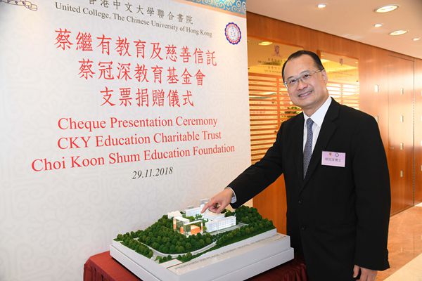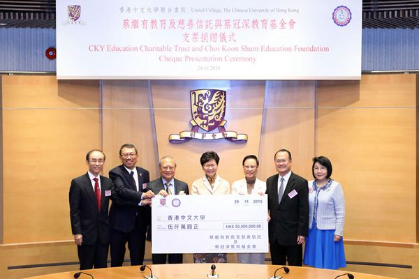 中大聯合書院昨日舉行「蔡繼有教育及慈善信託」與「蔡冠深教育基金會」支票捐贈儀式,以銘謝捐款人蔡冠深及蔡關穎琴慷慨捐贈5000萬元,支持聯合書院的發展。