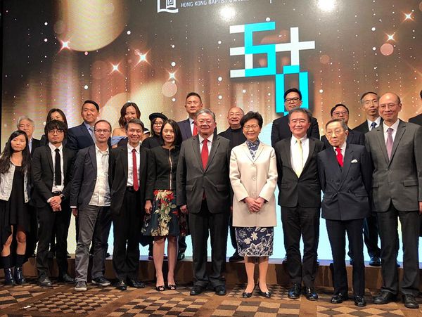 行政長官林鄭月娥(前右四)出席浸大傳理學院50周年院慶與得獎者合照,前右二為黃應士,前左四為陳民傑。