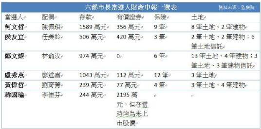 历经约半年的激烈竞争后,台湾地区六大都市新任市长诞生,并将于本月25日正式上任就职。据台“监察院”《廉政专刊》的资料显示,比较这6位市长当选人的财产,由存款多达1589万新台币的台北市长柯文哲拿下“存款王”头衔,而桃园市长郑文灿则因为拥有13笔土地、4笔建筑物等,可称为是“地产王”。