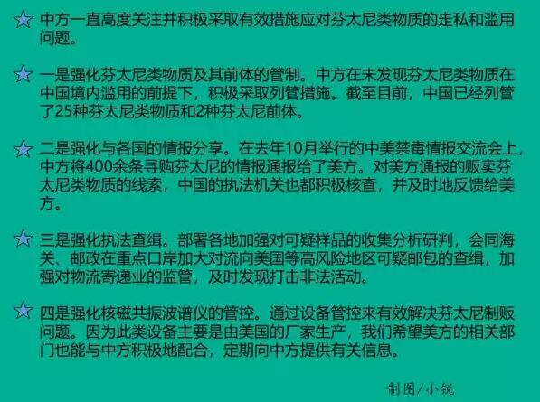 报道同时强调,“中方迄今采取的措施得到了包括美国在内国际社会的充分肯定。中方决定对芬太尼类物质进行整类列管,并启动有关法规的调整程序。”