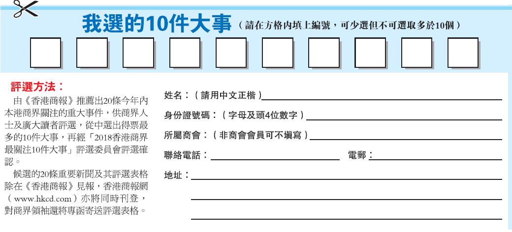 候選的20條重要新聞及其評選表格除在《香港商報》見報,香港商報網(www.hkcd.com)亦將同時刊登,對商界領袖還將專函寄送評選表格。