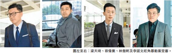 4名被告分別是梁天琦、李諾文、林傲軒及容偉業,同被控一項暴動罪,指他們於2016年2月8至9日在砵蘭街參與暴動。容另被控3項暴動、1項煽惑非法集結、1項非法集結及1項襲警罪,控罪指他於2月8至9日期間,在亞皆老街、山東街及花園街參與暴動、在砵蘭街煽惑他人參與非法集結並參與非法集結,以及在亞皆老街襲擊警員孔憲裘。而梁天琦於另6月的旺暴案審訊中被控暴動及襲警罪成被判囚6年。