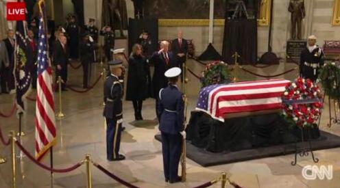【环球网报道记者 左甜】美国有线电视新闻网3日最新消息,当地时间12日3日晚上8点半左右,美国总统特朗普和第一夫人梅拉尼娅前往国会大厦圆形大厅瞻仰老布什灵柩,并敬礼,向已故前总统表达敬意。