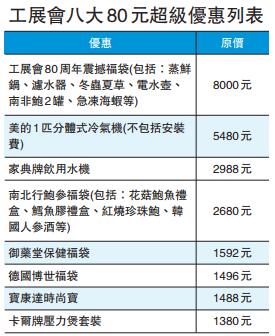 適逢工展會80周年慶,大會推出一系列震撼優惠與民同賀,工展會開幕當天推出以震撼價80元換購價值超過港幣8000元的「工展80周年震撼福袋」,以及80元的冷氣機(零售價:5480元)、飲用水機(零售價:2988元)及「鮑參」福袋(零售價:2680元)等優惠,保證市民能夠以超低價覓得心水貨品。另外,市民在現場消費滿指定金額,即可在場內新增的「數換購站」,以優惠價換購不同的產品,包括家電、旅行及個人用品等等。