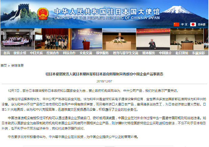 中国驻日本大使馆网站消息,12月7日,部分日本媒体报称日本政府拟以国家安全为由,禁止政府机构采购华为、中兴公司产品,我们对此表示严重关切。