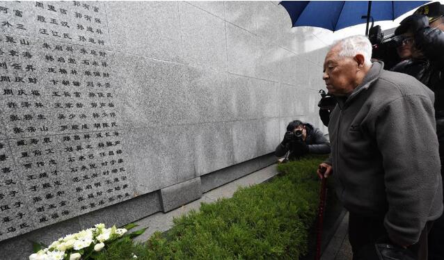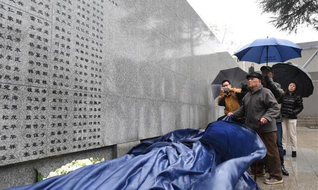 12月10日,南京大屠杀死难者遗属佘文彬(前)为遇难者名单墙的增刻名单揭幕。新华社