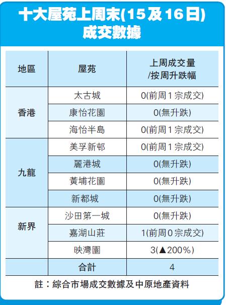 【香港商報网訊】記者呂婉玲報道:縱然觀塘新盤「凱汇」在上周四沽清首輪所有單位,市場氣氛看似轉佳,但二手銷情依然呆滯,十大屋苑未能在過去的周末帶來好消息。綜合四大地產代理行的統計資料,各行的十大指標屋苑上周末均錄得單位數字的交投數量,多個指標屋苑更維持零成交。